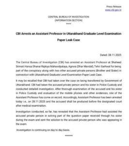 UKSSSC Paper Leak Case , November 29 , 2025: The Central Bureau of Investigation (CBI) has intensified its crackdown on the UKSSSC paper leak scandal, arresting Suman Chauhan, an assistant professor from a government college in Tehri Garhwal, on Friday. The arrest is linked to the alleged leak of the UKSSSC graduate-level recruitment examination conducted on September 25, 2025.